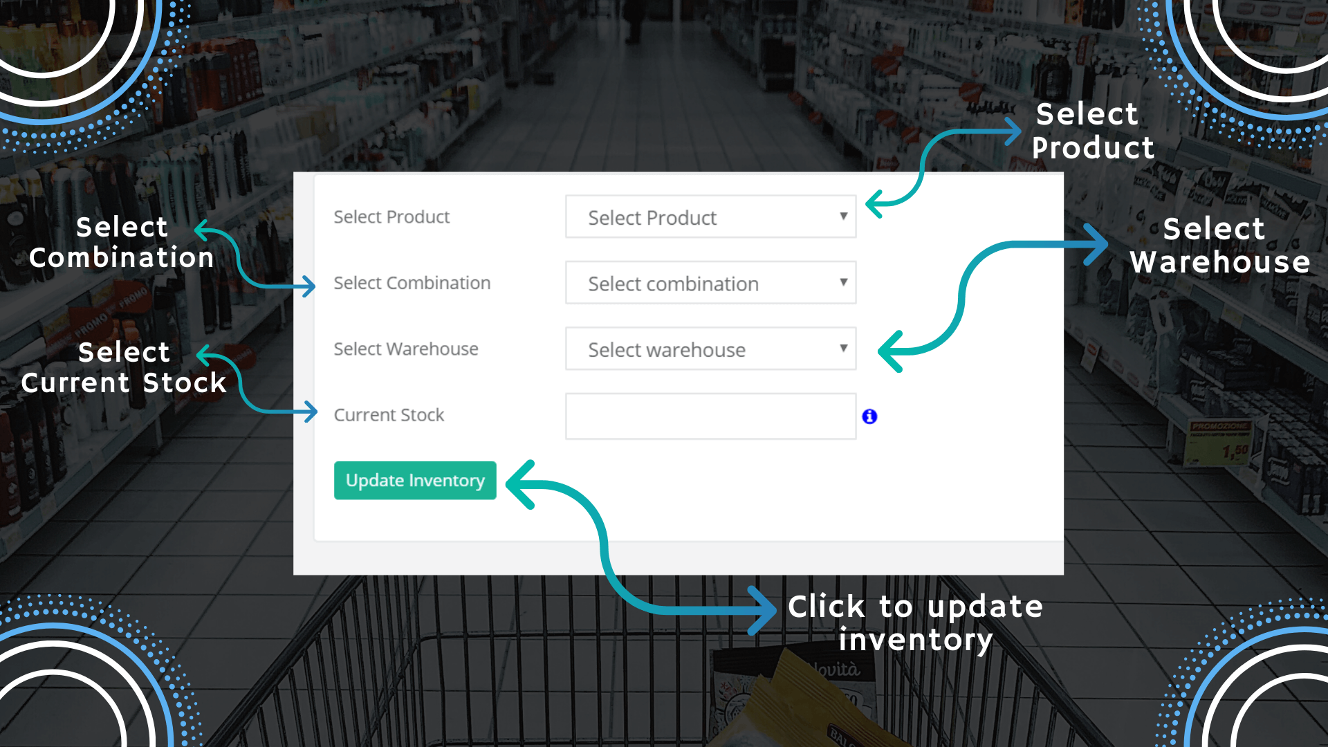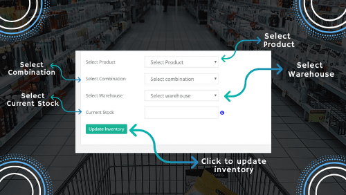 Let’s review more of it. Take your mouse to the inventory tab under the admin dashboard. Before you try to manage and update inventory, make sure to upload the latest stock of the product. Click on update inventory and a screen will appear. Select the desired product, its combination, & warehouse from the dropdown. Then mention the current stock of the selected product and click submit.