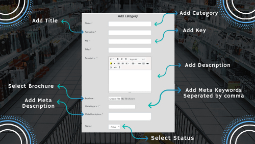The bold command will highlight your desired text. Alignment of the content can also be done using the center, left or right button. Similarly, it allows you to upload any media files. You can also attach a brochure to the category if you want by choosing and uploading files from your desktop or media. You can leave the brochure field empty as it is optional. Adding Meta keywords and Meta description of the category is an essential step. This is because the better the keywords and description here, the more is the chances of getting listed on the top of Google. You can’t skip entering Meta keywords and description for categories and hence make this selection wisely.
